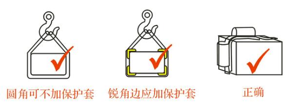 6.當(dāng)遇到負(fù)載有尖角、棱邊的貨物時(shí),必須采取護(hù)套、護(hù)角等方法來保護(hù)吊帶,以延長吊裝帶的使用壽命。嚴(yán)禁在粗糙表面使用吊帶。以免吊帶被棱角割斷和粗糙的表面劃傷。