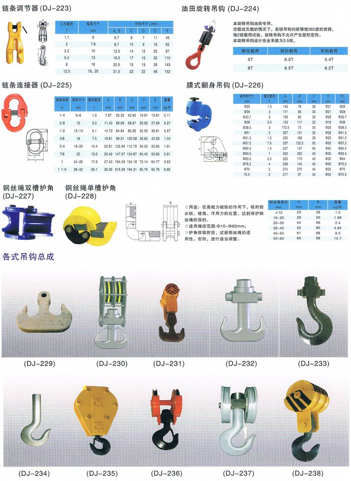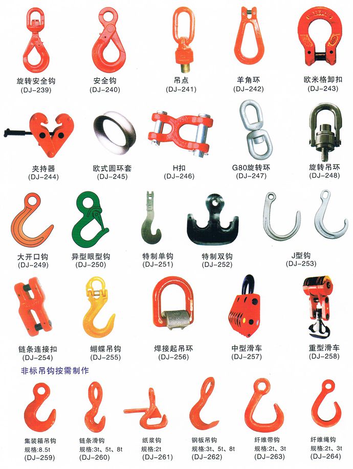 吊鉤主要有:旋轉吊鉤、美式貨鉤、眼型貨鉤、環眼貨鉤、S鉤、鼻形鉤、直柄吊鉤、羊角樺鉤、羊角抓鉤等。