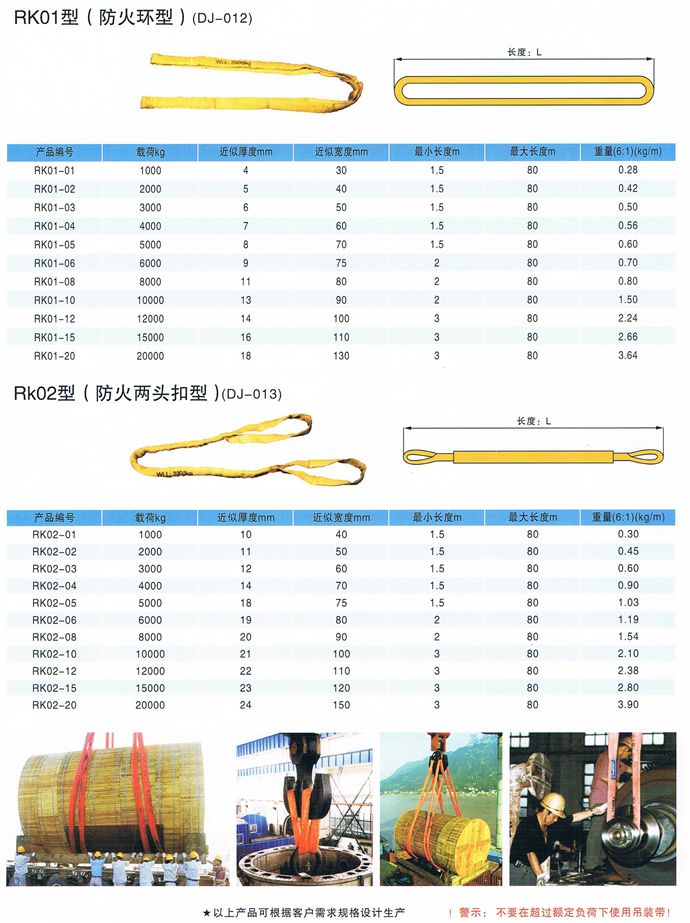 柔性吊裝帶不導電,無觸電危險,柔性吊裝帶是采用PES制成,內部承載芯采用無極環繞以構成循環狀PES織成不受力的套管對承載芯加以保護。柔性吊裝帶外表面光滑,對平滑的物體不會造成損傷,對易損物體不會造成損傷,適用于圓環形物體的吊裝,柔性吊裝帶負荷0.5-500噸,有效長度0.5-80米,符合中國行業標準JB/T8521-2007 ,柔性吊裝帶的彈性伸長較小,工作載荷下< 2%,斷裂載荷下<12% 14、使用的溫度范圍—40℃—180℃。